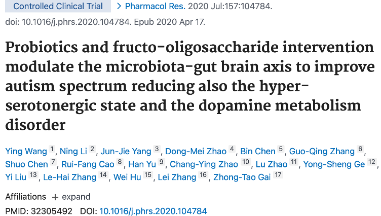 "プロバイオティクス+FOSの介入は、高セロトニン作動性状態およびドーパミン代謝障害を含むASD症状の改善と関連して、腸内細菌叢、SCFAおよびセロトニンを調節することができる"