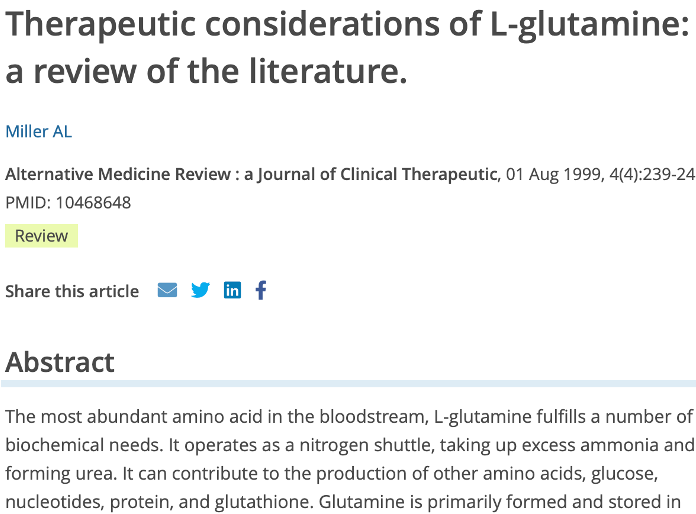 「血中に最も多く含まれるアミノ酸であるL-グルタミンは、生化学的な必要性を数多く満たしている。窒素シャトルとして働き、過剰なアンモニアを取り込んで尿素を形成する。他のアミノ酸、グルコース、ヌクレオチド、タンパク質、グルタチオンの生成にも寄与する。グルタミンは主に骨格筋と肺で生成・貯蔵され、小腸の腸細胞、リンパ球、マクロファージ、線維芽細胞の主要な代謝燃料となる。グルタミンを経口、経腸または非経口的に補給することにより、腸絨毛の高さが増加し、腸粘膜細胞の増殖が促進され、粘膜の完全性が維持される。」