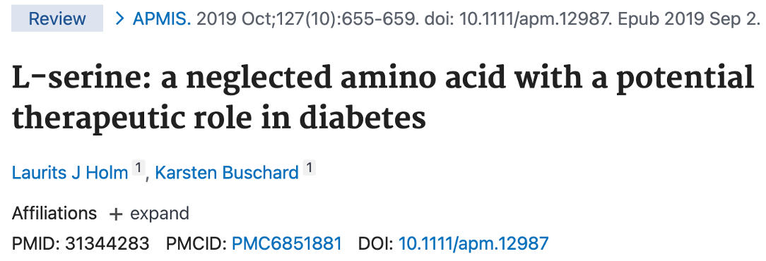 「L-セリン代謝は、1型、2型、妊娠糖尿病において変化しており、L-セリンの補給は、グルコースホメオスタシスとミトコンドリア機能を改善し、神経細胞死を減少させる。さらに、L-セリンはNODマウスにおける自己免疫性糖尿病の発症率を低下させる。L-セリンの栄養補助食品は、FDAによって一般的に安全とみなされている(GRAS)。」